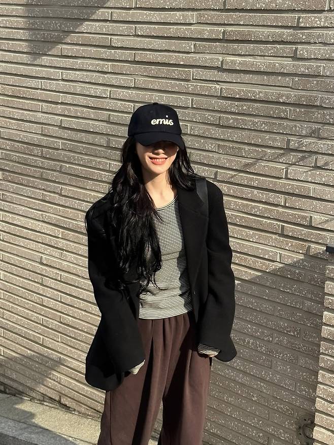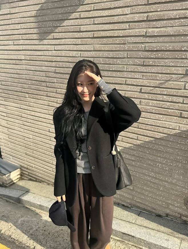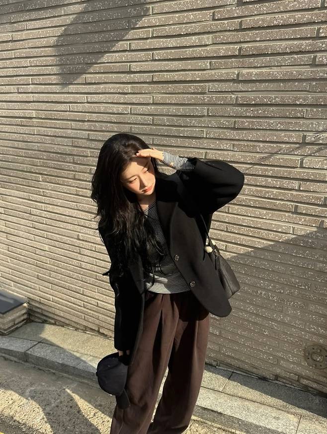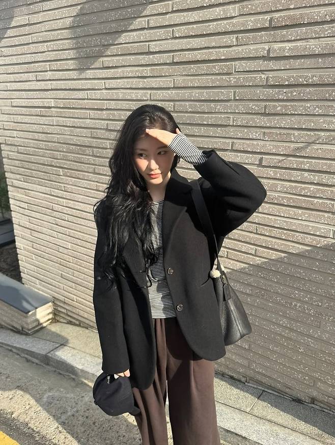 공개된 사진 속 채령은 블랙 박시 재킷에 스트라이프 티셔츠, 브라운 와이드 팬츠를 매치해 편안하면서도 분위기 있는 패션을 완성했다.