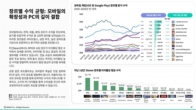 센서타워는 “모바일의 규모와 PC·콘솔의 프리미엄 가치가 결합될 때 지속 가능한 성장이 완성된다”고 평가했다.