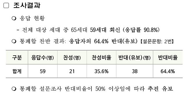 서울시교육청 강남서초교육지원청은 최근 대청초를 인근 영희초와 통폐합하는 안을 두고 대청초 학부모를 대상으로 설문조사를 진행했으나 반대 의견이 64.4%로 많아 폐교 결정이 최종 중단됐다고 2일 밝혔다.