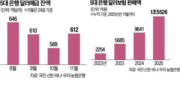 달러예금 잔액은 가파른 증가세를 보이고 있다. 국민 신한 하나 우리 농협 등 5대 시중은행의 달러예금 잔액은 이달 기준 612억달러로 집계됐다. 불과 한 달 새 43억달러 넘게 불어났다.