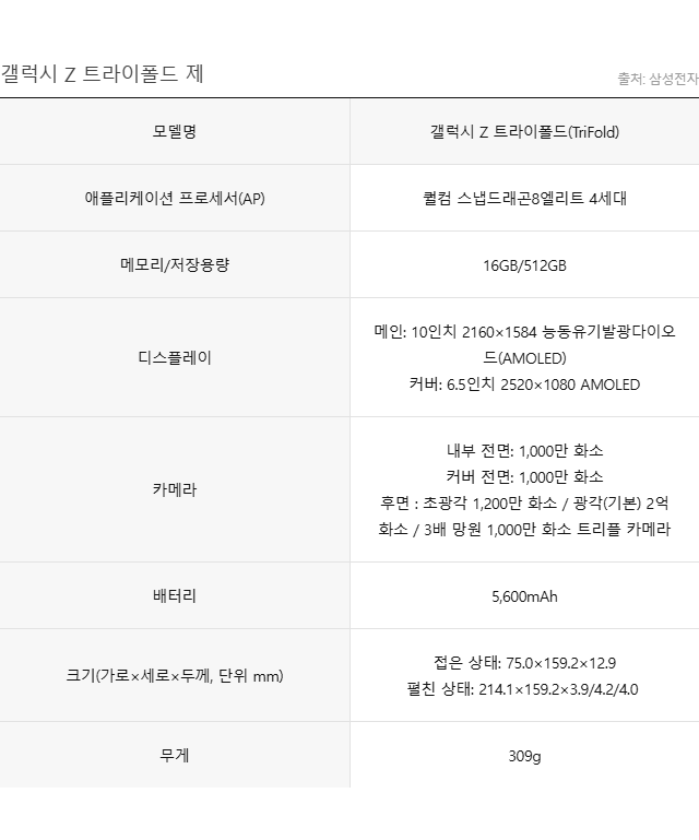 삼성전자는 2일 서울 서초구 삼성강남에서 미디어브리핑을 열고 갤럭시 Z 트라이폴드를 소개했다. 회사 측에 따르면 갤럭시 Z 트라이폴드는 접으면 갤럭시 Z 폴드7과 같은 6.5인치 디스플레이를, 펼치면 10인치 크기 디스플레이를 담았다. 2024년 중국 화웨이가 내놓은 3단 폴더블폰 '메이트 XT'가 'Z' 모양으로 접히는 것과 달리 화면 양쪽이 모두 안쪽으로 접히는 '인폴딩' 구조라 내부 메인 디스플레이를 보호하기에 안성맞춤이라고 한다.