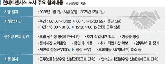 이번 합의로 성연공장 근로자들의 근로시간은 기존 주간 기준 오전 6시50분~오후 4시에서 오전 6시45분~오후 3시30분으로 25분 줄어들게 된다. 야간 근무의 경우 오후 4시~오전 1시30분에서 오후 3시30분~오전 0시15분으로 45분 감소한다. 노사는 지난 1일부터 시범 운영에 돌입했고, 내년 1월 1일부터 본시행에 나선다는 계획이다.