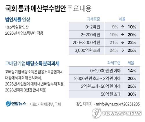 (서울=연합뉴스) 김민지 기자 = 내년부터 고배당 상장 기업에 투자해 받는 주식 배당소득의 분리과세에서 50억원 초과 구간을 신설하고, 이 구간에 대한 최고 세율을 30%로 적용하는 조세특례제한법(조특법) 개정안이 2일 국회 본회의를 통과했다.
