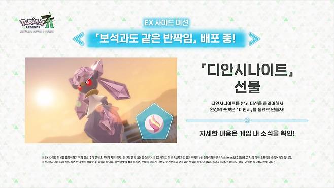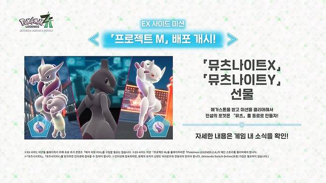 또한 EX 사이드 미션으로 뮤츠나이트X, 뮤츠나이트Y, 디안시나이트를 제공 중이다. EX 사이드 미션은 DLC를 구매하지 않아도 포켓몬 레전즈 Z-A 본편 메인 스토리만 완료했다면 즐길 수 있다.