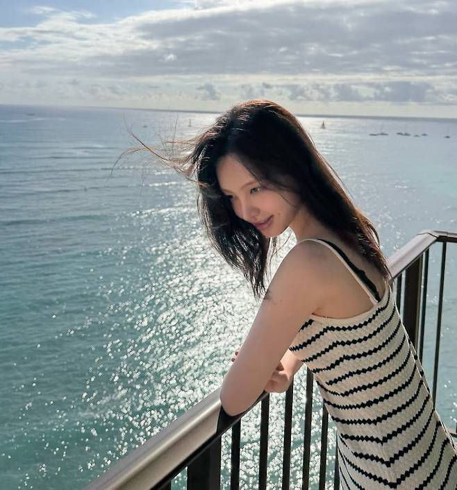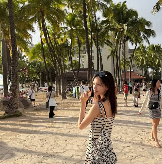 리즈는 줄무늬 슬립 원피스와 자연스러운 스타일링으로 휴양지 패션을 선보인 가운데 야자수가 가득한 산책로를 여유롭게 거닐었다. 햇살이 반짝이는 바다를 배경으로 난간에 기대어 미소를 짓기도 했다. 푸른 바다와 빛 반사가 어우러져 광고 같은 장면이 탄생했다.