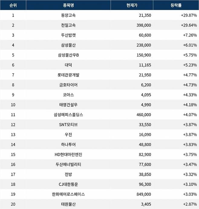 이어 상승률 2위 천일고속(000650)은 현재가 398,000원으로 주가가 +29.64% 폭등하고 있다. 상승률 3위 두산밥캣(241560)은 현재 60,600원으로 +7.26% 상승하며 견조한 모습을 보이고 있다. 상승률 4위 삼성물산(028260)은 +6.01% 상승하며 238,000원에 거래되고 있다. 상승률 5위 삼성물산우B(02826K)는 +5.75%의 상승세를 타고 150,900원에 거래되고 있다.