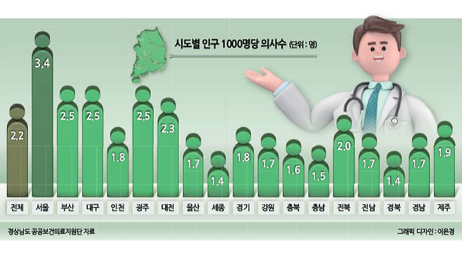 2025년 8월 기준 국내 인구 1000명당 활동 의사 수는 서울의 경우 3.4명이다. 하지만 경북 1.4명, 충남 1.5명, 충북 1.6명, 전남과 경남은 각각 1.7명으로 서울과 격차가 2배 이상 난다.