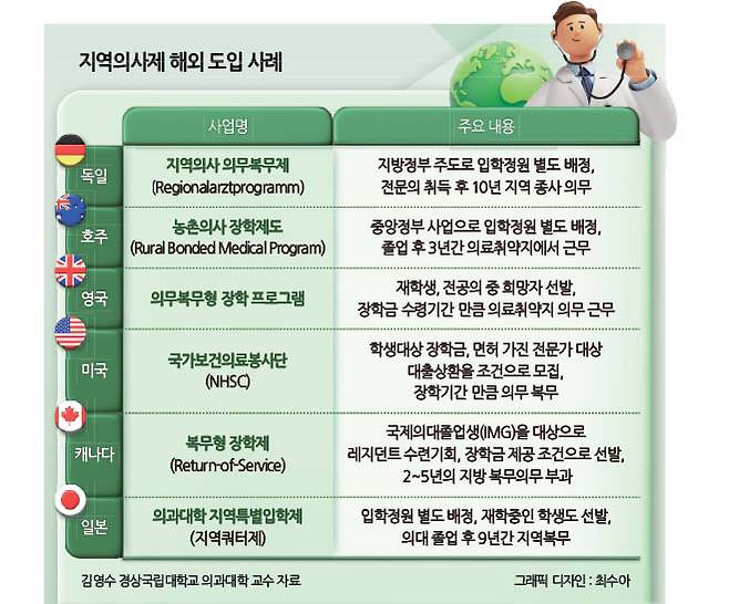 일본은 ‘의과대학 지역특별입학제(지역쿼터제)’, 독일은 ‘지역의사 의무복무제(Regionalarzt programm)’, 호주는 ‘농촌의사 장학제도(Rural Bonded Medical Program)’, 미국은 ‘국가보건의료봉사단(NHSC)’, 영국은 국립보건서비스(NHS) 산하 ‘의무복무형 장학 프로그램’, 캐나다는 ‘복무형 장학제(Return-of-Service Program)’를 통해 농촌·오지 등 의료취약지역의 의사 부족 문제를 해결하고 있다.