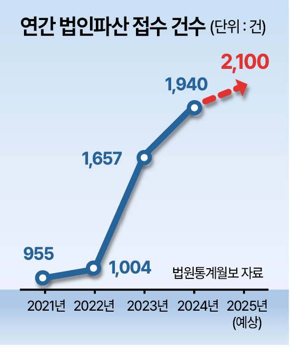 핵심은 법원의 문을 두드리는 법인파산 접수 건수가 매년 증가세라는 점이다. 코로나19가 한창이던 2021년 전국 법원의 연간 법인파산 접수 건수는 955건이었다. 이후 2022년 1004건으로 1000건을 돌파했고, 2023년엔 1657건으로 대폭 증가했다. 지난해엔 1940건이었다.
