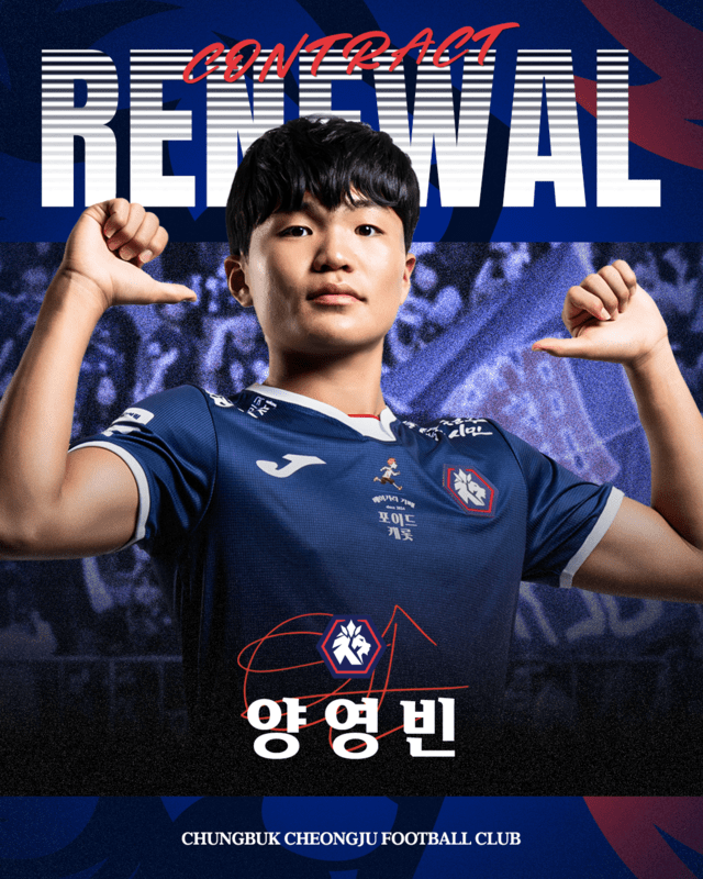 구단과 재계약을 체결한 양영빈은 "첫 프로팀인 충북청주 FC와 계속 함께할 수 있어 감사하다"며 "내년에는 더 많은 경기에 나서 팬들에게 기쁨을 드리고 싶다"라는 소감을 밝혔다.