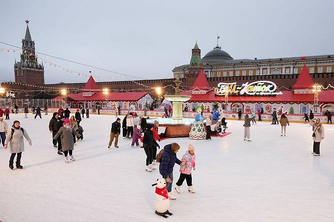 [모스크바=AP/뉴시스] 2일(현지 시간) 러시아 모스크바 붉은광장에 설치된 아이스링크에서 시민들이 스케이트를 지치고 있다. 2025.12.03.