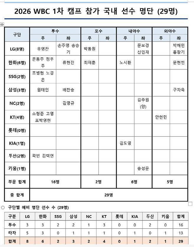 KBO는 3일 “2026 WBC를 대비한 대표팀 1차 캠프 참가 선수들을 확정했다”며 “투수 16명, 야수 13명 등 총 29명으로 구성됐다”고 밝혔다.