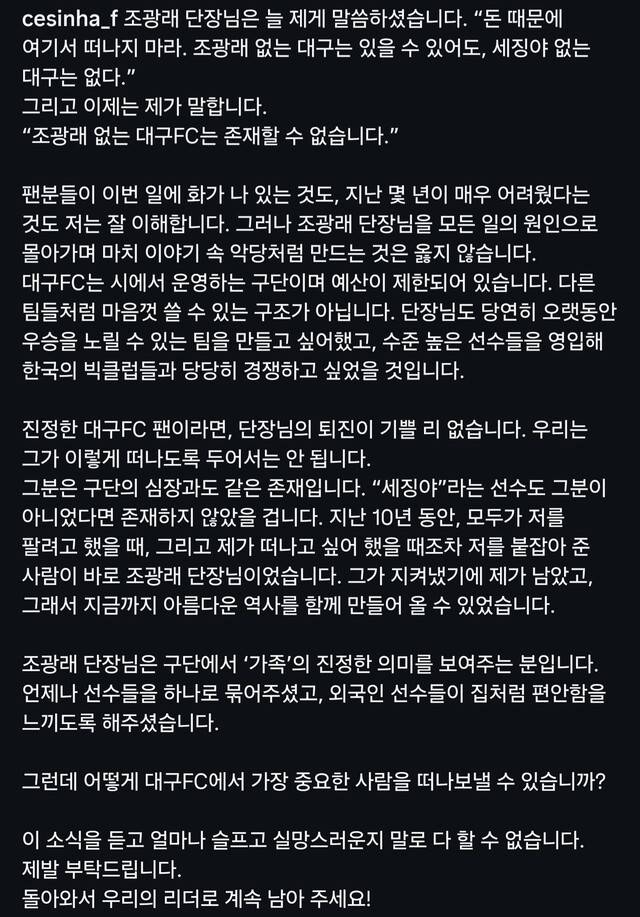 세징야는 "조 대표이사가 '돈 때문에 떠나지 마라. 조광래 없는 대구는 있을 수 있어도, 세징야 없는 대구는 없다'라고 말한 적이 있다. 이제는 내가 '조광래 없는 대구 FC는 존재할 수 없다'라고 말하고 싶다"라고 한 뒤, "어떻게 대구 FC에서 가장 중요한 사람을 떠나보낼 수 있나? 얼마나 슬프고 실망스러운지 말로 표현할 수 없다. 제발 부탁드린다. 돌아와 우리의 리더로 남아달라"라고 호소했다.
