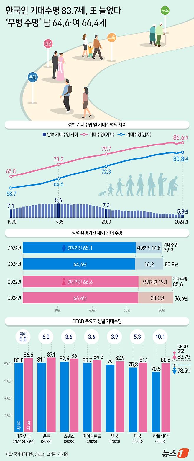 [오늘의 그래픽] 한국인 기대수명 83.7세, 또 늘었다…'무병 수명' 남 64.6·여 66.4세