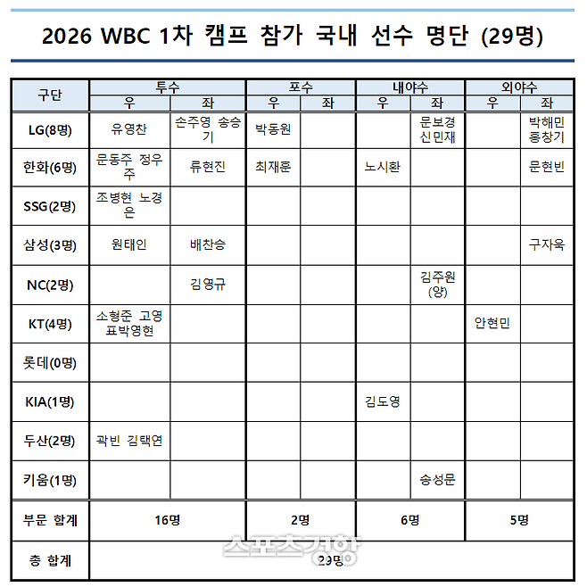 KBO 전력강화위원회가 내년 3월 열리는 월드베이스볼클래식(WBC) 대표팀 1차 캠프에 참가할 국내 선수 명단을 확정했다. 전력강화위원회는 내년 1월 9일부터 21일까지 사이판에서 열리는 1차 캠프 국내 선수단 29명을 3일 발표했다. 투수 16명, 야수 13명이다.