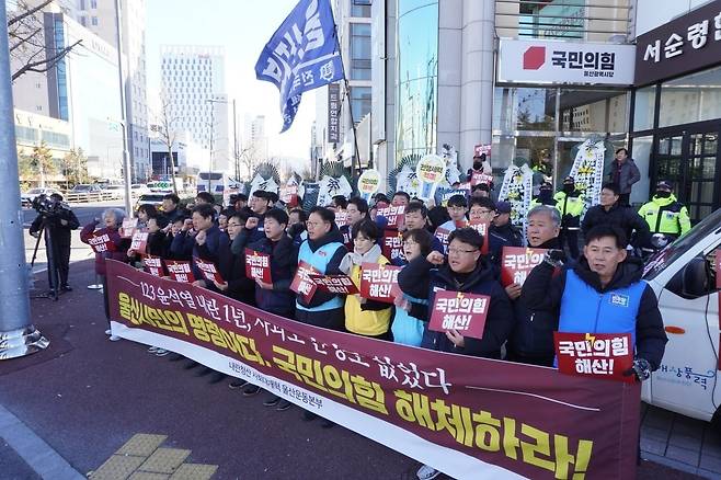 | ▲ 울산지역 노동계와 시민사회단체, 정당이 3일 울산 남구 국민의힘 울산시당 앞에서 집회를 열고 국민의힘 해산을 요구하고 있다. |