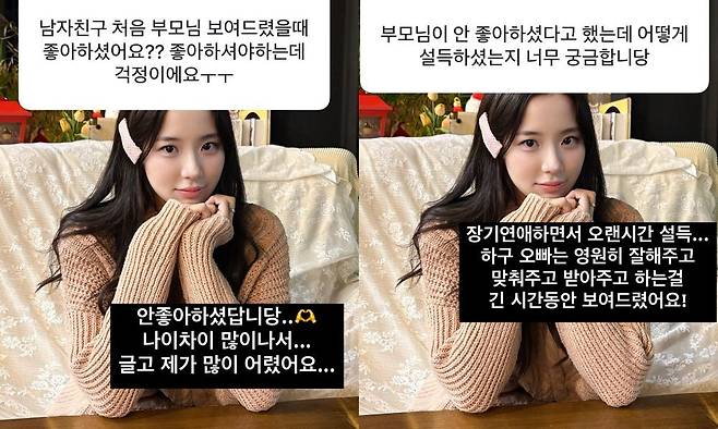 이어 또 다른 팬이 "부모님 안 좋아하셨다고 했는데 어떻게 설득했냐"라고 묻자 최연수는 "장기 연애하면서 오랜 시간 설득했다. 오빠가 영원히 잘해주고 맞춰주고 받아주고 하는 걸 긴 시간 동안 보여드렸다"라며 남편의 변함없는 노력과 배려가 결국 부모님의 마음을 움직였다고 밝혔다.