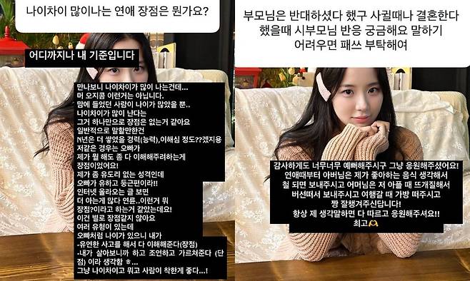 나이 차이 많이 나는 연애의 장점에 대한 질문에 최연수는 "맘에 들었던 사람이 나이가 많았을 뿐이지 나이 차이가 난다는 것 자체의 장점은 없다"라며 솔직하게 답했다. 다만 "경력이나 이해심 정도가 일반적인 장점일 수는 있다"라며 "제가 유도리 없는 성격인데 오빠는 둥글고 이해심이 커서 다 받아주려는 점이 좋았다. 나이보다 사람의 착한 게 중요하다"라고 강조했다.