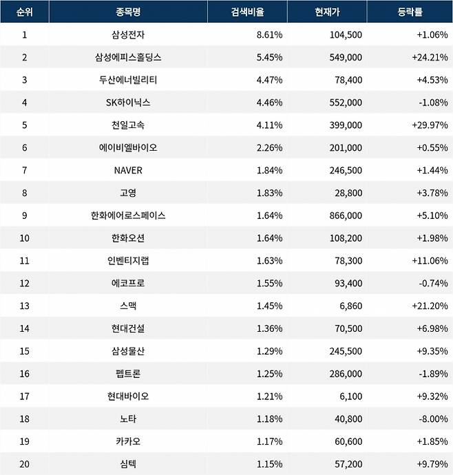 이어 검색비율 2위의 삼성에피스홀딩스(0126Z0)는 폭등률 24.21%로 마감했다.