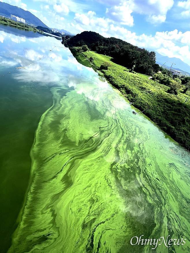 | ▲ 2025년 8월 16일 오전, 합천창녕보 상류 우곡교 쪽 낙동강 녹조. |