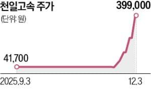 3일 천일고속은 가격제한폭(29.97%)까지 오른 39만9000원에 마감했다. 주가가 단기 급등해 투자경고종목으로 지정되면서 거래가 정지된 지난달 26일과 이달 1일을 제외하면 9거래일 연속 상한가다. 지난달 18일 3만7850원이었던 주가는 10배 넘게 뛰었다.