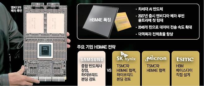 베이스다이가 중요해진 것은 HBM4E가 지금까지 만들어진 HBM과는 차원이 다른 기술적 난도를 갖는 제품이기 때문이다. 2027년 출시 예정인 엔비디아의 베라 루빈 울트라에 처음 탑재될 예정인 HBM4E는 기존 HBM보다 핀 수가 2048개로 훨씬 많다. GPU와 데이터를 주고받는 회로가 늘어난다는 의미다. 대역폭과 전력 효율도 엔비디아 요구에 따라 대폭 향상돼야 하는 것으로 알려져 있다.