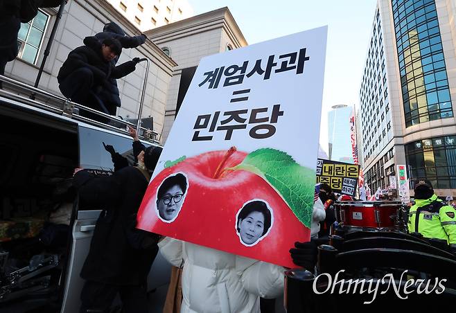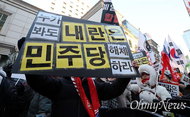 100여 명 남짓 모인 이들은 "빨갱이 아웃", "반국가 세력들 모두 뒤져야(죽어야) 한다"는 극언을 쏟아냈다. 또 계엄에 반대하고 사과한 한동훈 전 국민의힘 대표 등을 싸잡아 맹비난하며 "내쫓"으라고 요구했다.
