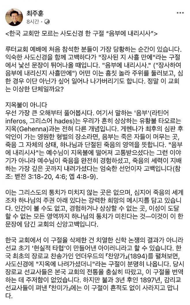 대부분의 한국교회 예배에는 등장하지 않는 사도신경 속 ‘음부에 내려가사’ 구절에 대한 논쟁이 다시 수면 위로 떠올랐다. 최주훈 중앙루터교회 목사가 3일 SNS에 관련 글을 올린 뒤 반응이 빠르게 확산하면서다. 게시물은 단시간에 ‘좋아요’ 500개 이상, 공유 100회 이상을 기록했다.