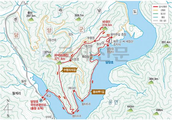 근교산&그 너머 취재팀은 전남 담양군 용면 담양호 수변 산책로인 용마루길과 비네산(278.4m)~과녁바위산(371.4m)을 연결해 소개한다.
