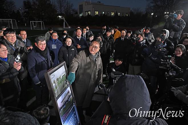 | ▲ 우원식 국회의장이 3일 서울 여의도 국회에서 열린 '비상계엄 해제 1주년 기억행사' 다크투어에서 도슨트로 참여해 시민들과 함께 국회운동장 헬기 착륙 지점을 돌아보고 있다. |