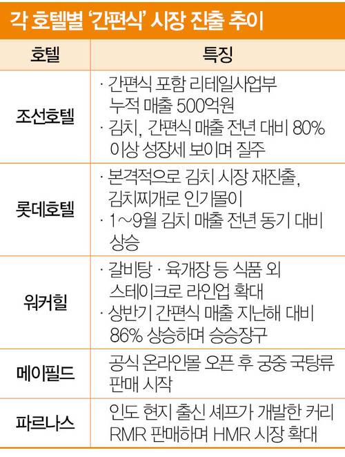 유통 업계 관계자는 “HMR 제품은 성수기·비수기를 가리지 않고 안정적인 매출을 가져다준다. 객실, 식당 매출에만 의존하는 전략서 변화를 꾀하는 각 호텔 입장에선 새로운 먹거리로 매력도가 높을 수밖에 없다”고 설명했다.