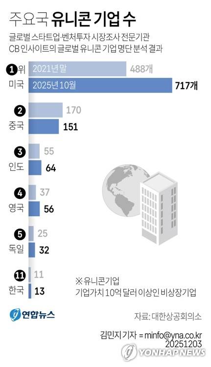 (서울=연합뉴스) 김민지 기자 = 3일 대한상공회의소가 글로벌 스타트업·벤처투자 시장조사 전문기관 CB 인사이트의 글로벌 유니콘 기업 명단을 분석한 결과, 한국이 세계 11위 수준에 머무른 것으로 나타났다.
