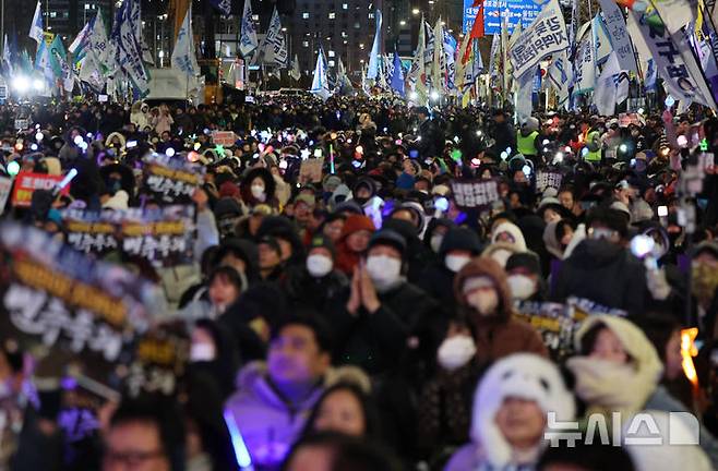 [서울=뉴시스] 황준선 기자 = 12·3 비상계엄 1년을 맞은 3일 밤 서울 여의도 국회 앞에서 열린 12.3 내란외환 청산과 종식, 사회대개혁 시민대행진에서 참석자들이 응원봉을 흔들고 있다. 2025.12.03. hwang@newsis.com