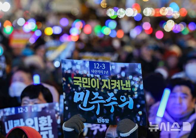 [서울=뉴시스] 황준선 기자 = 12·3 비상계엄 1년을 맞은 3일 밤 서울 여의도 국회 앞에서 열린 12.3 내란외환 청산과 종식, 사회대개혁 시민대행진에서 참석자가 손피켓을 들고 있다. 2025.12.03. hwang@newsis.com