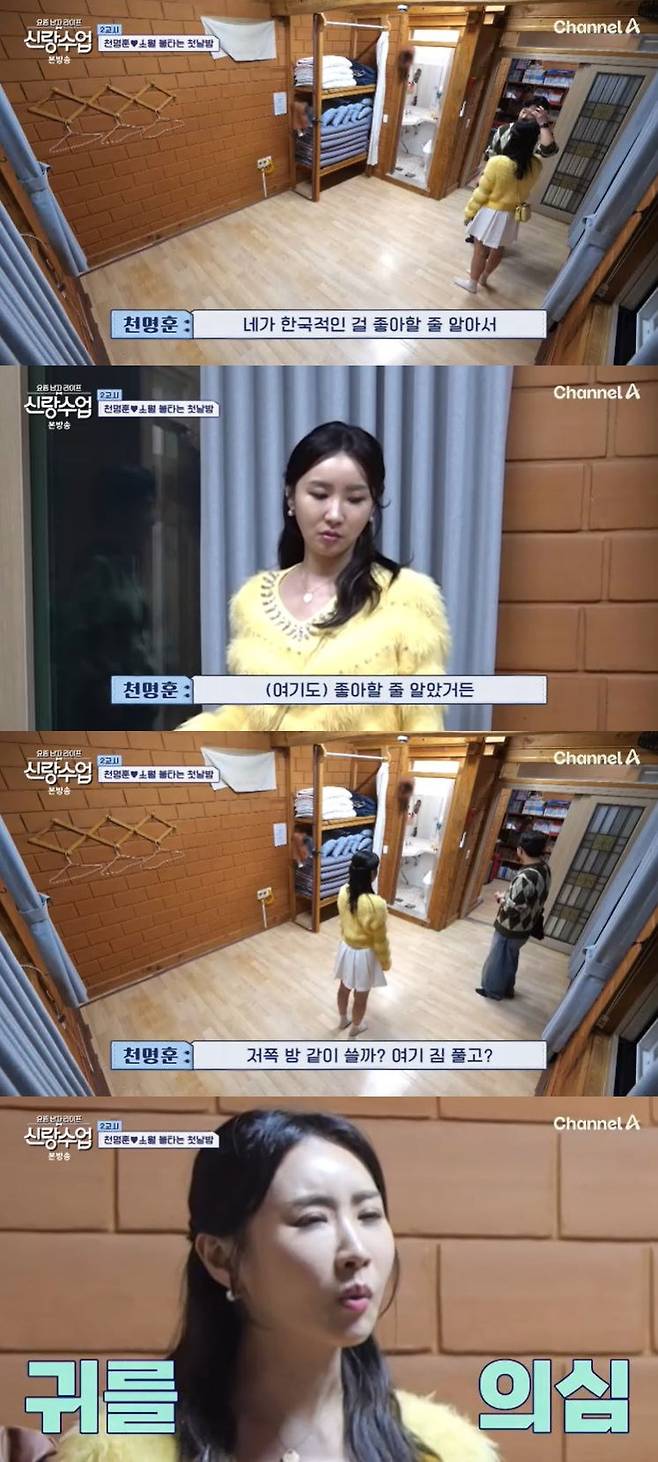 3일 방송된 채널A '요즘 남자 라이프-신랑수업'(이하 '신랑수업')에서는 천명훈과 소월이 임실로 1박 2일 여행을 떠나 첫날밤을 보내는 모습이 담겼다.