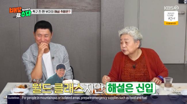 이영표는 “제가 중계할 때 바꿔야 할 게 있냐”고 물었다. 강부자는 “너무 매끄럽게 한다. 가끔은 우스갯소리도 하고 해야 한다”라고 조언했다. 이에 이영표는 “너무 정확하다. 제가 봐도 안정환은 재밌다. 정말 신기한 게 경기가 비기거나 지고 있으면 KBS로 온다. 경기가 이기면 안정환한테 간다”라고 설명했다.