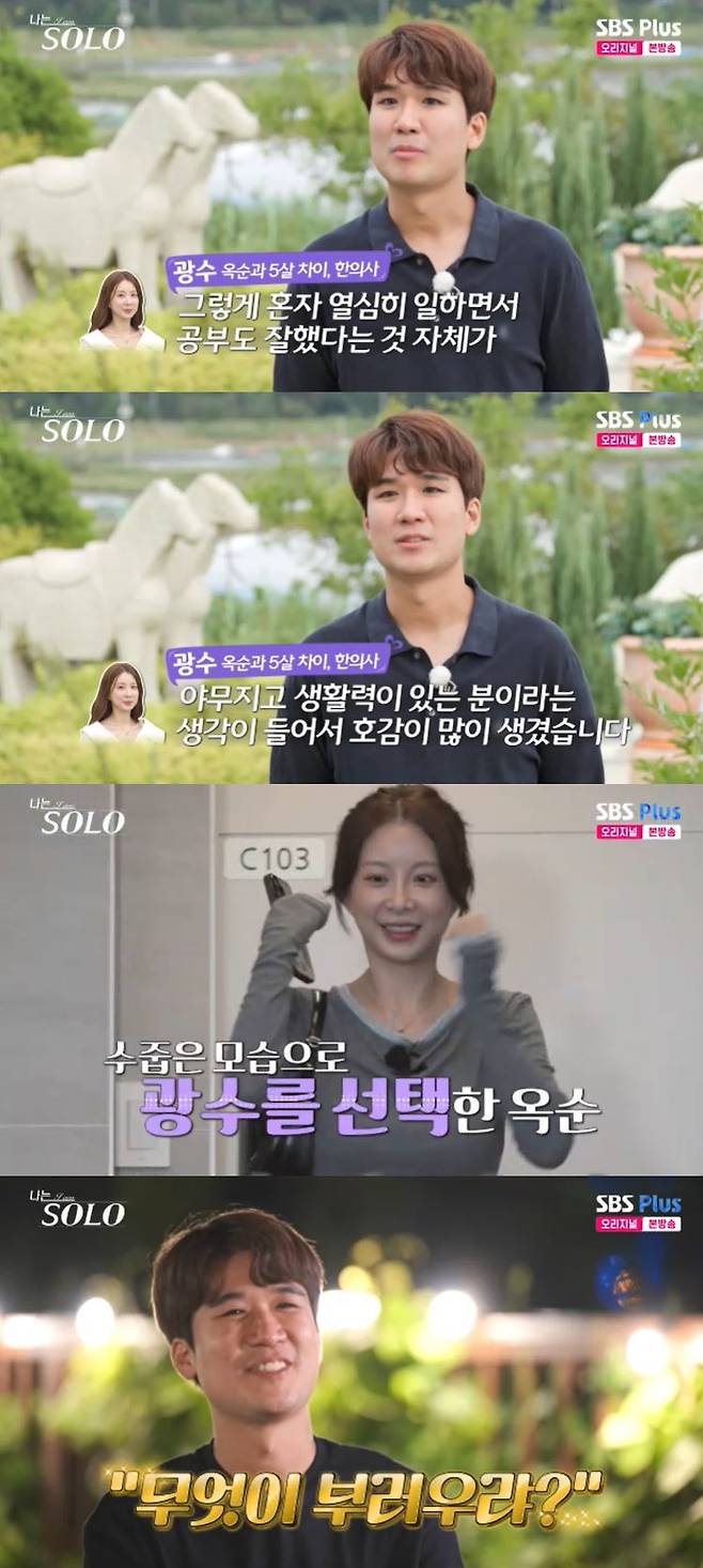 이후 여성 출연자들이 데이트할 남성을 선택하게 됐다. 옥순보다 5세 연하 한의사인 광수는 인터뷰를 통해 "일단 옥순님한테 제가 마음이 있다는 걸 더 확실하게 표현하고 싶다"라며 "웃는 것도 너무 예쁘고, 직군도 저랑 비슷하고 혼자 열심히 일하면서 공부도 잘했다는 것 자체가 야무지고 생활력이 있는 분이라는 생각이 들어서 호감이 많이 생겼다"라고 말했다.