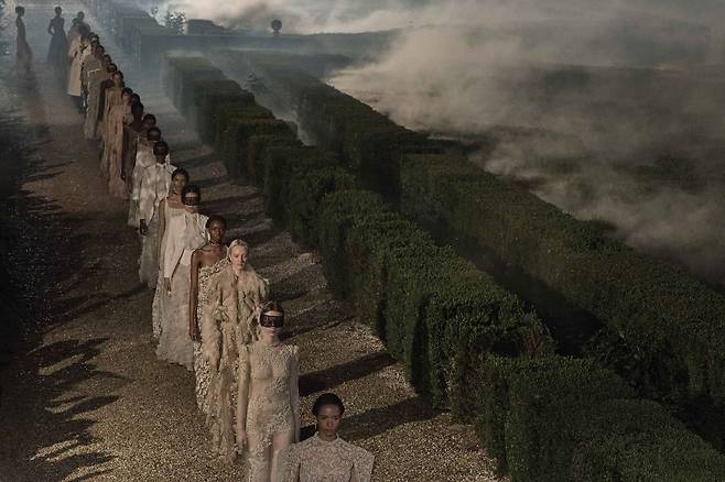 Dior Villa Albani Torlonia 빌라 알바니 토를로니아, 로마 마리아 그라치아 키우리는 디올 하우스에서의 마지막 쇼를 위해 처음으로 자신의 고향인 로마로 향했다. 장소는 고대 그리스·로마 유물을 소장한 빌라 알바니 토를로니아다. 당대 최고 예술 후원자인 알레산드로 알바니 추기경의 컬렉션을 보관하기 위해 지은 이 빌라는 현지인조차 쉽게 발을 들일 수 없는 미지의 공간이자 패션 이벤트가 열린 사례는 더욱 드문 개인 소유지다. 베일에 가려진 비밀 정원을 따라 레이스 마스크를 쓴 모델들이 워킹을 시작할 때 번개와 폭우, 어두워진 하늘이 겹쳐지며 이 낯선 풍경은 더욱 신화적으로 변했다. 섬세한 깃털과 자수, 실크로 완성한 드레스 퍼레이드는 ‘시간이 멈춘 순간, 아름다운 혼란’이라는 테마와 완벽히 맞물렸다. 행렬이 끝난 뒤 키우리가 모습을 드러내자 기립 박수와 함께 거짓말처럼 비가 멈추며 디올에서의 9년간의 여정이 막을 내렸다.