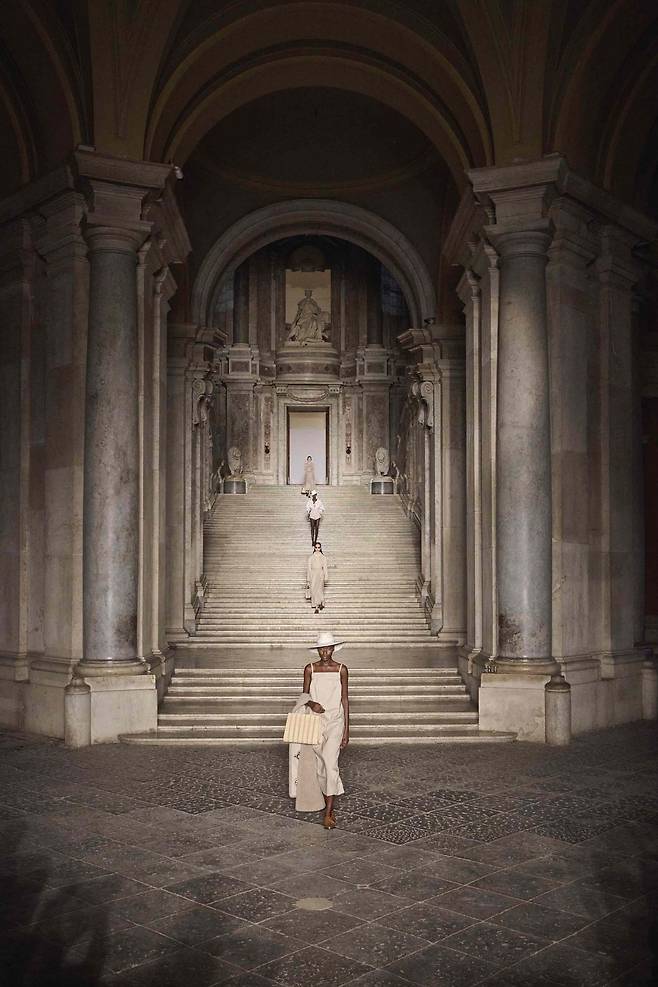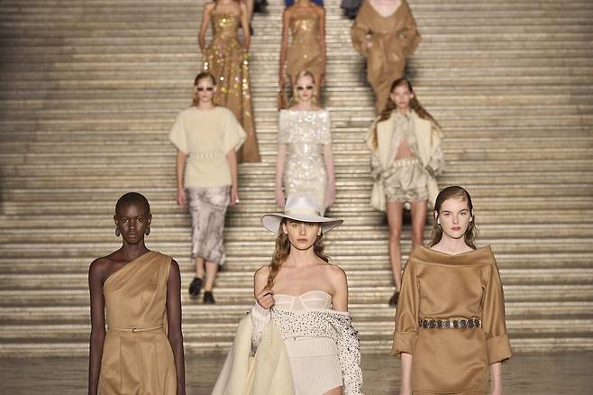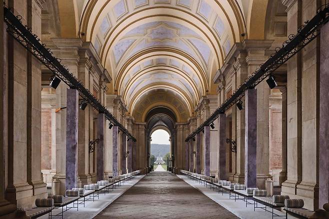 Max Mara La Reggia di Caserta카세르타 왕궁, 나폴리 베르사유 궁전에 견주기 위해 설계된 이탈리아 카세르타 왕궁은 유럽 최대 규모 궁전 중 하나로 한때 마리 앙투아네트의 언니인 마리아 카롤리나 왕비가 머문 곳이다. 나폴리 외곽에 있는 이 건축물의 하이라이트는 웅대한 대리석 계단, 그리고 끝없이 이어진 회랑이다. 이 공간은 영화 〈스타워즈: 에피소드 1 - 보이지 않는 위험〉 〈콘클라베〉에도 등장한 적 있으나, 컬렉션의 무대가 된 건 막스마라가 처음이다. 크리에이티브 디렉터 이언 그리피스는 “이번 시즌의 주제는 ‘Italianicity’, 즉 이탈리아를 이탈리아답게, 그리고 매력적으로 만드는 것에 대한 이야기입니다”라고 설명한다. 벨티드 슈트, 포근한 파스텔 핑크 코트, 아이코닉 캐멀 팔레트, 그리고 샤론 스톤과 귀네스 팰트로 같은 할리우드 로열패밀리들의 참석까지, 모든 요소가 이탈리아와 막스마라를 우아하면서도 세계적으로 확장시키기 충분했다.