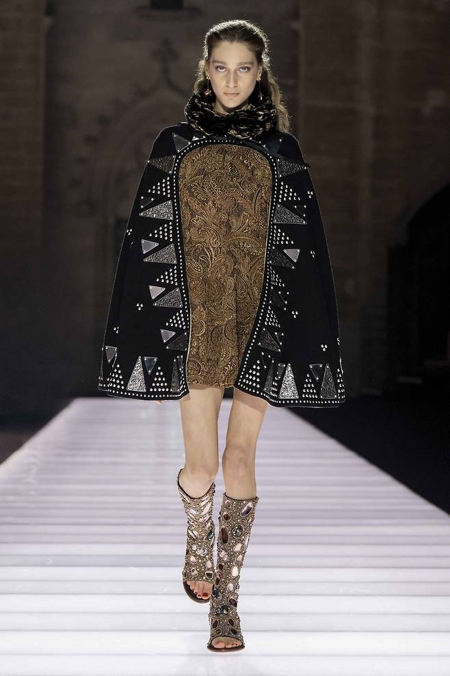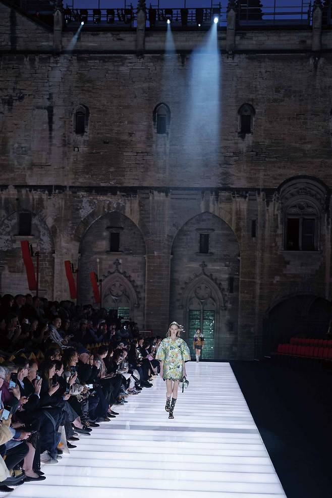 Louis Vuitton Palais des Papes 팔레 데 파프, 아비뇽 늘 전형적인 장소에서 탈주해 런웨이 예술을 보여주던 루이 비통은 14세기에 지은 프랑스 아비뇽의 교황청, 팔레 데 파프를 선택했다. 유럽 최대의 고딕 궁전이자 올해 유네스코 세계문화유산 등재 30주년을 맞은 이곳은 오늘날 실험적인 연극 축제가 열리는 무대로도 잘 알려졌다. 쇼가 열린 교황청의 중심부 쿠르 도 뇌르엔 옥좌를 연상케 하는 붉은 의자들이 설치됐고, 브리지트 마크롱, 케이트 블란쳇, 엠마 스톤 등 유명 게스트들이 장엄함이 내려앉은 이 자리에 앉았다. 크리에이티브 디렉터 니콜라 제스키에르는 늘 그렇듯, 역사성과 미래주의를 뒤섞은 룩으로 마법 같은 컬렉션을 선보였다. 황홀한 금사 자카드 웨어, 주얼 장식을 더한 부츠, 구조적인 실루엣 등 모델들은 먼 행성에 불시착한 중세 여인을 보는 듯했다.