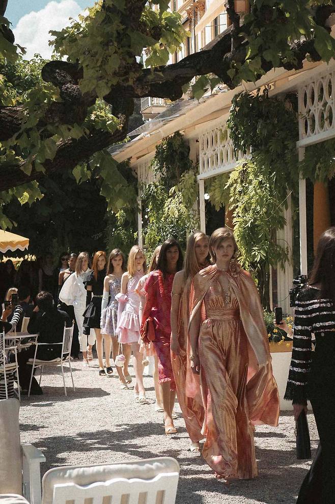 Chanel Villa d’Este 빌라 데스테, 코모 샤넬의 무대는 이탈리아 코모 호수에 자리한 16세기 건축물인 빌라 데스테다. 이곳은 수많은 유명 인사와 예술가, 영화배우들이 즐겨 찾는 궁전형 호텔. 신비로운 물빛과 아름다운 산릉선을 배경으로 햇살이 드리우는 풍경은 도심에서 멀리 떨어지지 않은 근교를 찾는 이들에게 가장 쉽게 호사를 즐길 수 있는 옵션이기도 하다. 이런 장소성이 반영된 듯 샤넬 크리에이션 스튜디오는 실용성과 여유에 기반한 리조트 룩을 줄 세웠다. 초경량 트위드, 스트라이프 니트, 이브닝 파자마 등 한층 짧고 가벼워진 룩들은 연말 호캉스를 그리는 모두에게 휴식 모드를 선사하는 완벽한 선택지처럼 보인다. 올드 할리우드 글램을 연상케 하는 오페라 글러브와 블랙 선글라스, 진주 목걸이로 스타일을 마무리하며 샤넬 특유의 한 끗을 더했다.