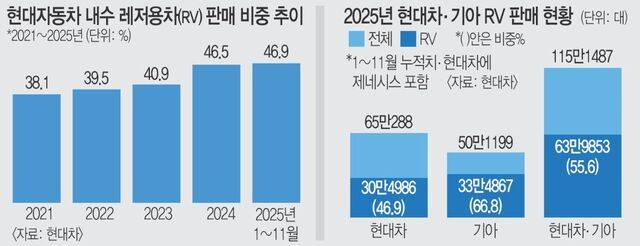 수출에서도 RV의 존재감이 커졌다. 현대차가 국내 공장에서 생산해 해외로 보낸 약 95만대 중 68.0%가 RV였다. 지난해 전체 기준 비중(59.7%)보다 높았다. 기아 역시 국내 판매·수출 모두에서 RV 비중이 약 70%로 비슷한 구조를 보인다. RV는 승용차 대비 가격과 이익률이 높아 양사 영업이익에 큰 도움을 주는 차종으로 꼽힌다.