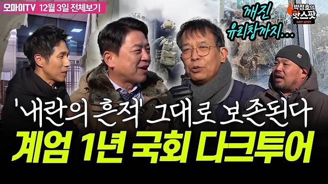 ◎ 박정호 > 시청자 여러분 안녕하십니까, 박정호입니다. 저희가 안에 있다가 밖으로 나왔습니다. 12·3 내란 1년, 빛의 혁명 1주년을 맞아서 저희 박정호의 핫스팟 특별 방송을 준비했는데요. 국회 앞에, 본청 앞에서 세 분과 함께합니다. 부승찬 민주당 의원, 김종대 교수, 윤수현 대표와 함께합니다. 안녕하십니까? 아 지금 제가 그사이에 입이 얼어가지고 입이 잘 안 움직입니다. 이 혹한에 저희가 이 국회에 나와 있습니다. 자, 1년 전에 이 현장에서 계엄군에 맞섰던, 또 이 대한민국의 민주주의를 지켜냈던 시민들을 생각하면서 저희가 이제 나와 있는데. 일단은 한 분 한 분 소회를 좀 듣고 싶어요. 의원님, 말씀 좀 해주십시오.