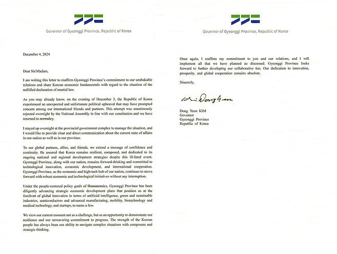 김동연 지사가 12·3 내란 사태 발생 다음날인 지난해 12월 4일 외국 정상, 주지사, 국제기구수장, 주한대사, 외국의 투자기업들에 '긴급서한'을 보낸 것도 이 때문이다. 김 지사는 '긴급서한'에서 "불운한 이 사건에도 불구하고 한국은 회복력 있고 차분하게 국가 및 지역발전 전략에 최선을 다하고 있으므로 안심하셔도 좋다"며 "우리는 지금 이 순간을 난관이 아니라, 우리의 회복력과 확고한 발전 의지를 보여주는 기회로 보고 있다"고 역설했다.
