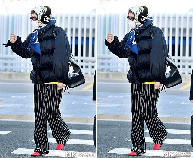 블랙 패딩에 큼지막한 샤넬 백을 걸친 지디는 샤넬 로고가 새겨진 퍼 귀덮개, 그리고 자신의 시그니처 아이템인 할머니 스카프를 머리에 묶었고, 분홍빛 틴트 선글라스와 스트라이프 팬츠, 그리고 레드 슈즈를 매치해 독보적인 ‘GD 패션’을 선보였습니다.