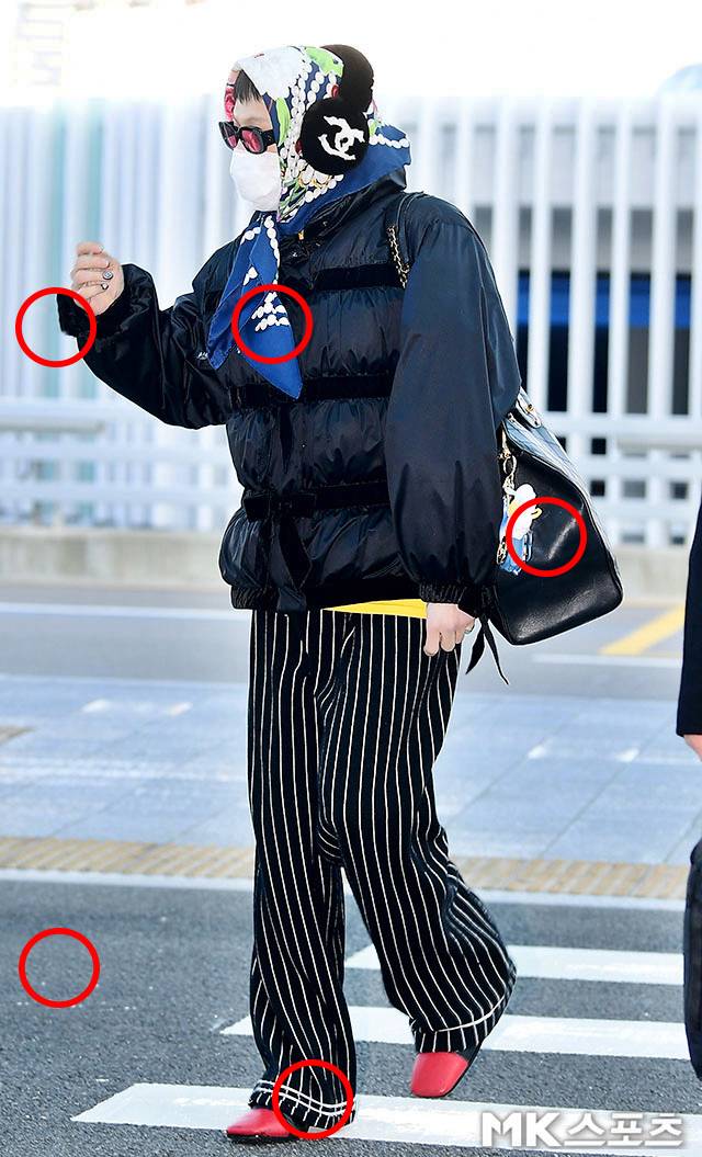 블랙 패딩에 큼지막한 샤넬 백을 걸친 지디는 샤넬 로고가 새겨진 퍼 귀덮개, 그리고 자신의 시그니처 아이템인 할머니 스카프를 머리에 묶었고, 분홍빛 틴트 선글라스와 스트라이프 팬츠, 그리고 레드 슈즈를 매치해 독보적인 'GD 패션'을 선보였습니다.