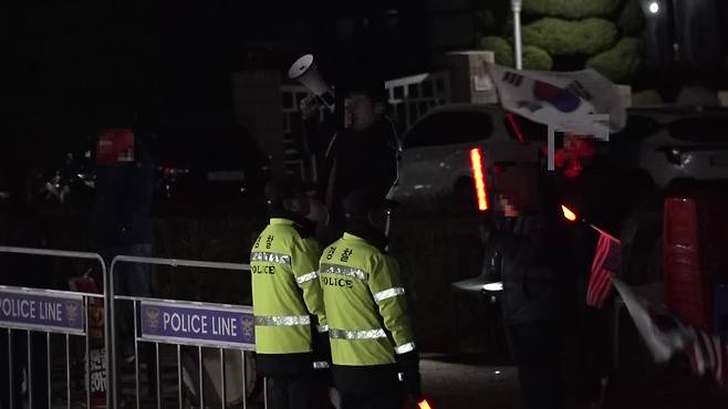 차량과 사람이 나올 때마다 확성기를 사용해 "부정선거 사형" "범죄 집단 해체하라"고 외쳤습니다. 노래를 부르고 꽹과리도 쳤습니다. 직원들이 탄 통근버스가 드나들 땐 목소리가 더 커졌습니다.