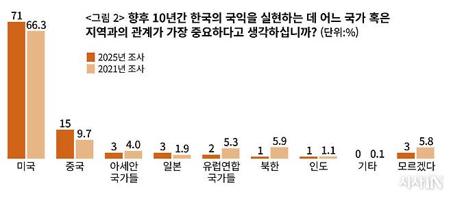 2021년 조사 때와 1순위 응답만을 비교하면 중국은 5.3%포인트, 미국 역시 4.7%포인트 올랐다. 북한이 5.9%에서 1%로 하락했고, 일본은 1.9%에서 3%로 상승했다. 2021년 당시 미국과 중국이 우리에게 가장 중요하다고 답한 수치가 두 나라를 합쳐 76%였는데, 이번에는 86%로 올랐다. 미국과 중국으로 수렴되는 국제질서의 양극화가 심각해지고 있다는 인식이 강해진 셈이다.