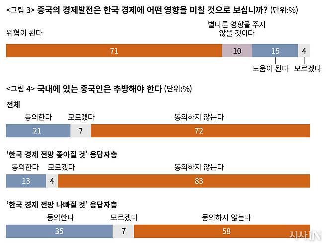 실제로 이번 조사에서 두드러지는 ‘배경변수’가 있었다. 지지 정당, 이념적 차이만큼이나 뚜렷한 지표였다. 그것은 ‘경제 상황’ 평가였다. 한국 경제 상황이 나쁘거나 앞으로 나빠질 것이라는 응답층에서 중국 이슈 전반에 대해 반감이 깊었다. 예컨대 ‘국내에 있는 중국인을 추방해야 한다’라는 극단적 진술에 전체 응답자의 72%가 동의하지 않았다(동의한다 21%). 그런데 이 비율은 한국 경제가 좋아질 것이라는 응답자층에서는 13%에 그친 반면, 나빠질 것이라는 응답자층에서는 35%를 차지했다. 두 배 훨씬 넘는 차이다(〈그림 4〉). 중국인 단체 관광객의 무비자 입국에 대해서도 한국 경제가 좋아질 것이라는 응답자는 56%가 찬성한 반면, 나빠질 것이라는 응답자는 19%만 찬성했다.