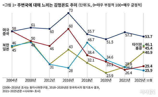 이번에는 어떨까. 한반도 주변국에 대한 감정온도를 살펴보자(〈그림 1〉 참조). 이번 조사에서도 여전히 미국이 53.7도로 가장 높았고, 북한이 25.9도로 가장 낮았다. 중국은 29.4도였다. 2021년 조사 때와 비교해보면 중국은 오히려 3도 올랐고, 미국은 3.6도 낮아졌다. 일본에 대한 감정온도가 28.8도에서 40.9도로 대폭 올랐는데, 이를 견인한 것은 20대와 국민의힘 호감층이었다.